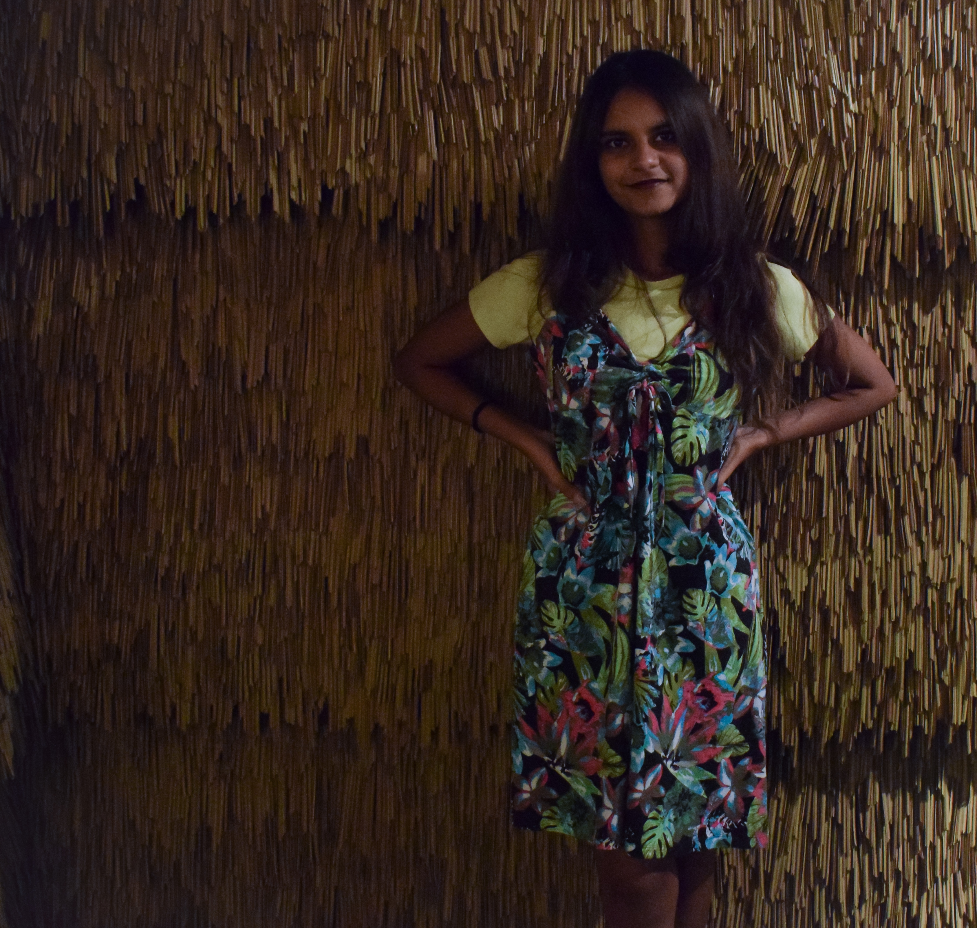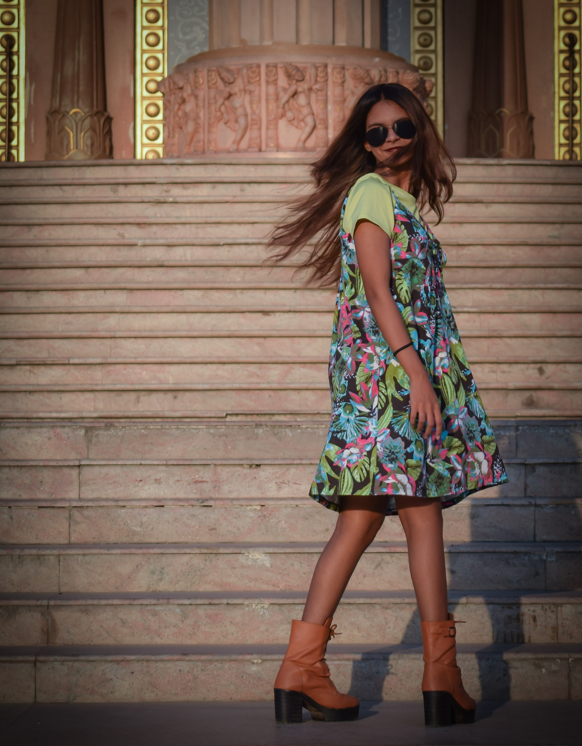 I decided to pair my floral dress with lime green T-shirt as the base color if my dress is green. Since the dress is covered up in heavy floral pattern I would recommend you to pair with something plain as it won’t steal the thunder of your dress. Instead, it will help in highlighting those beautiful patterns.